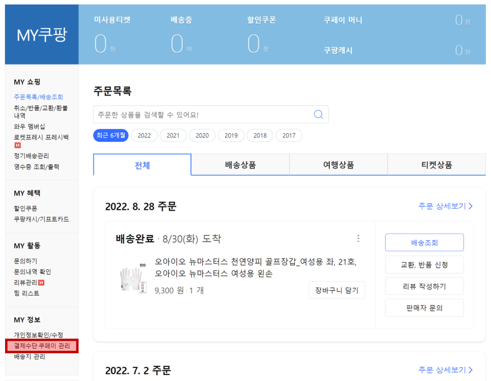 쿠팡의 경우 결재 취소 과정이 단순하고 별도의 취소 수수료가 없으므로 결재 이후에 취소를 하면 된다.